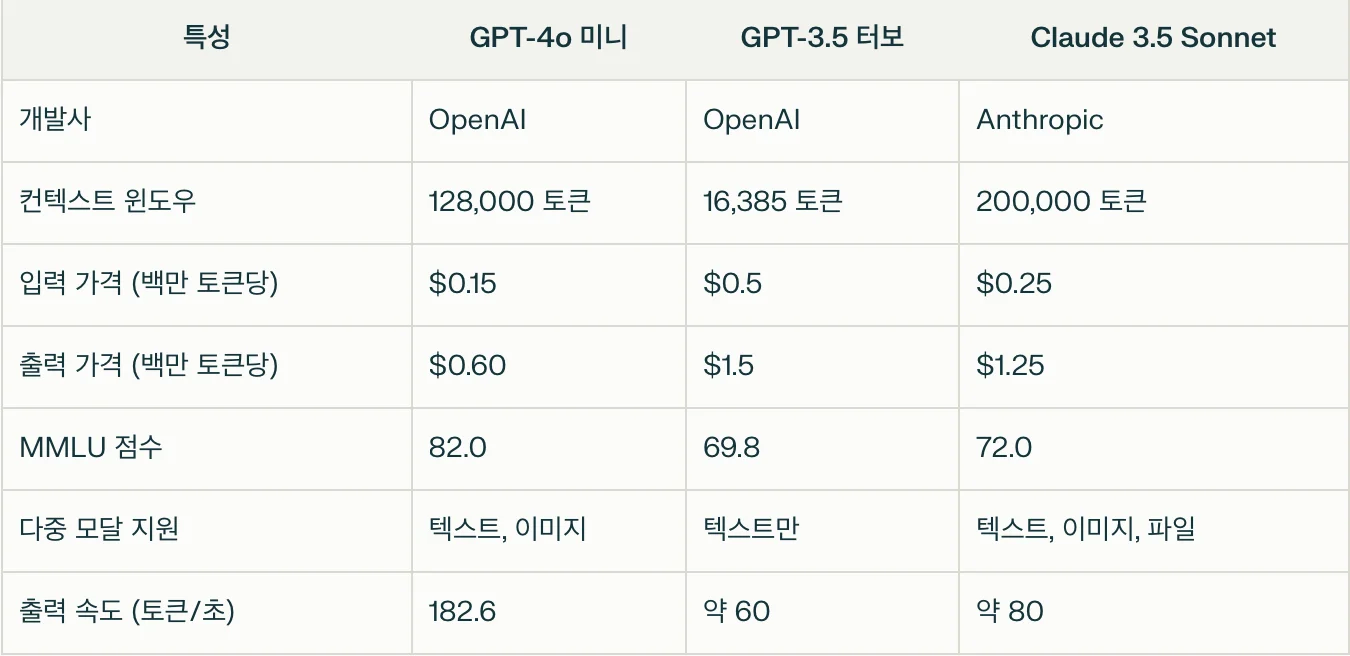 GPT-4o Mini vs GPT-3.5 Turbo vs Claude 3.5 쏘넷 모델 성능 비교